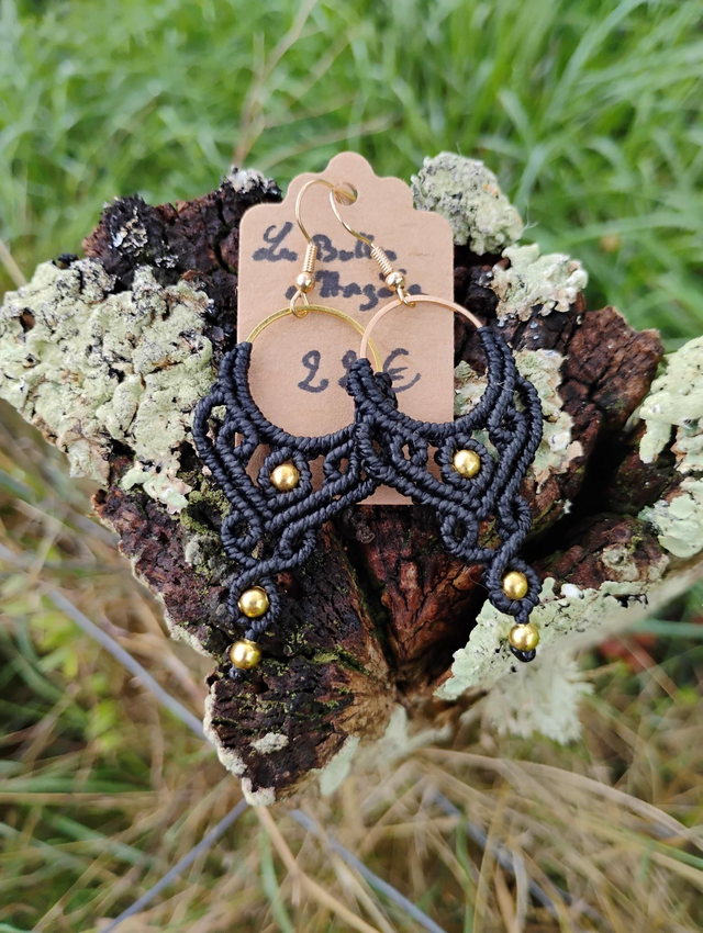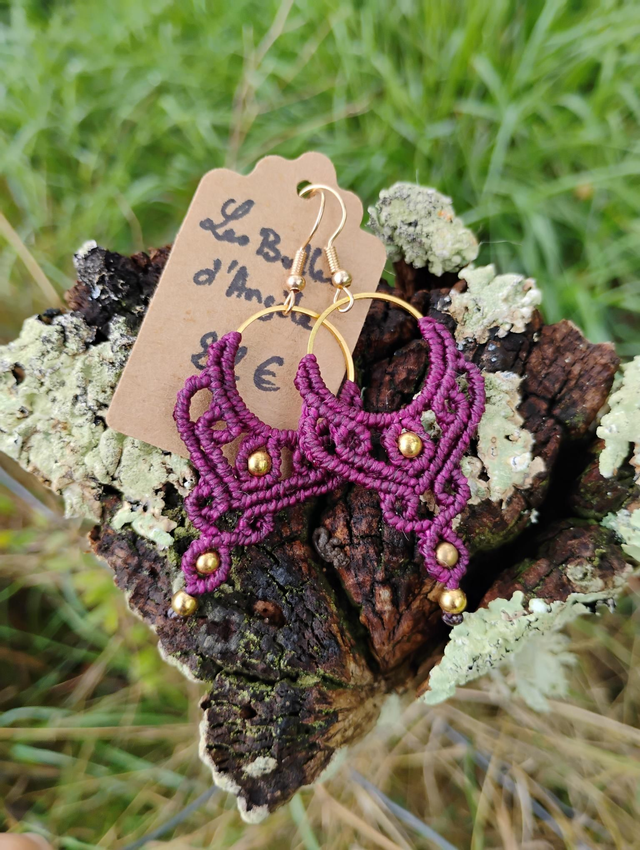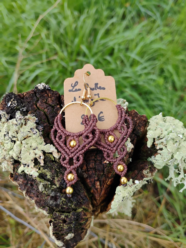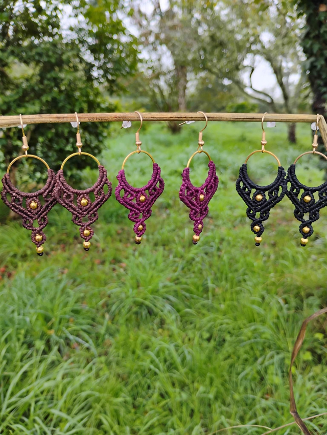 Boucles d'oreilles en micro macramé, tissées avec fil Linhasita d'1m et anneau, perles et crochet en laiton doré.